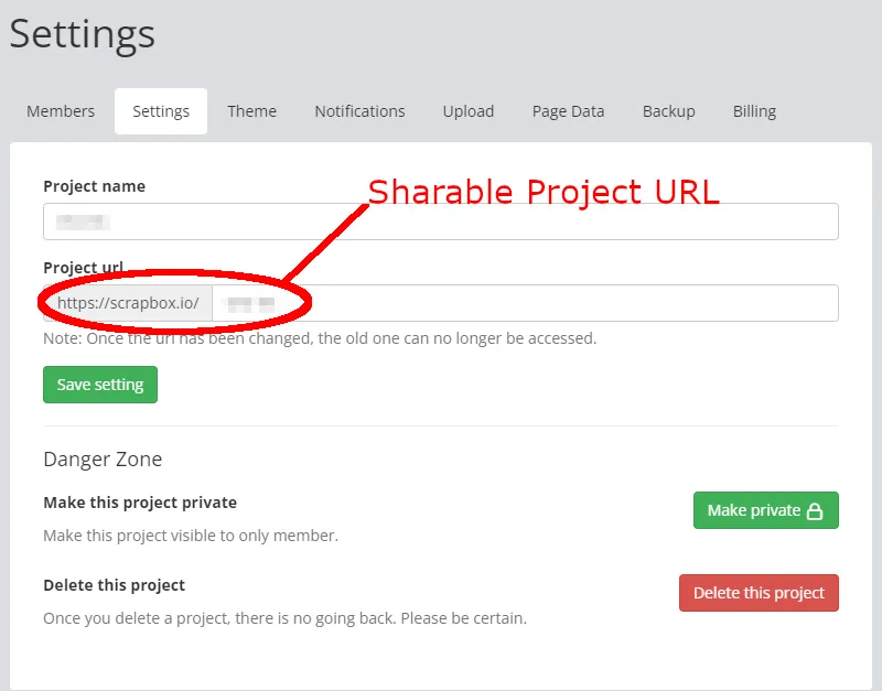 - Settings: Allows you to change the project link, public and private settings, and other project details.