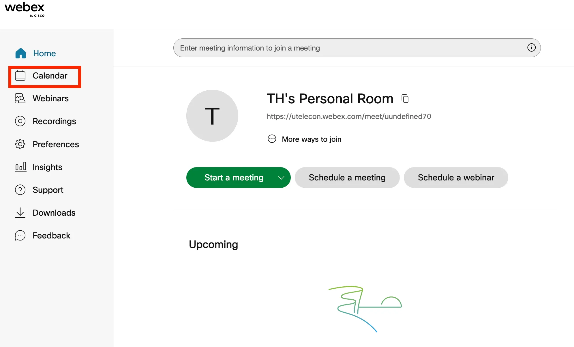 - Any meetings/webinars scheduled within a week will be shown on the home screen. If you wish to select a webinar scheduled more than a week away, you can search for it by clicking “Calendar” on the left of the home screen and entering the desired date.
