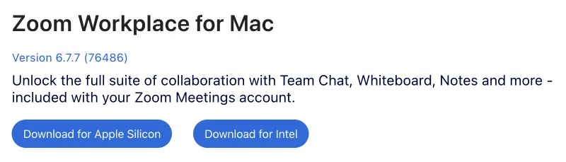 - Click the “Download” button for “Zoom Workplace”. The Zoom Workplace installer will be downloaded. (“Zoom Workplace” is the name of the application used for Zoom.)