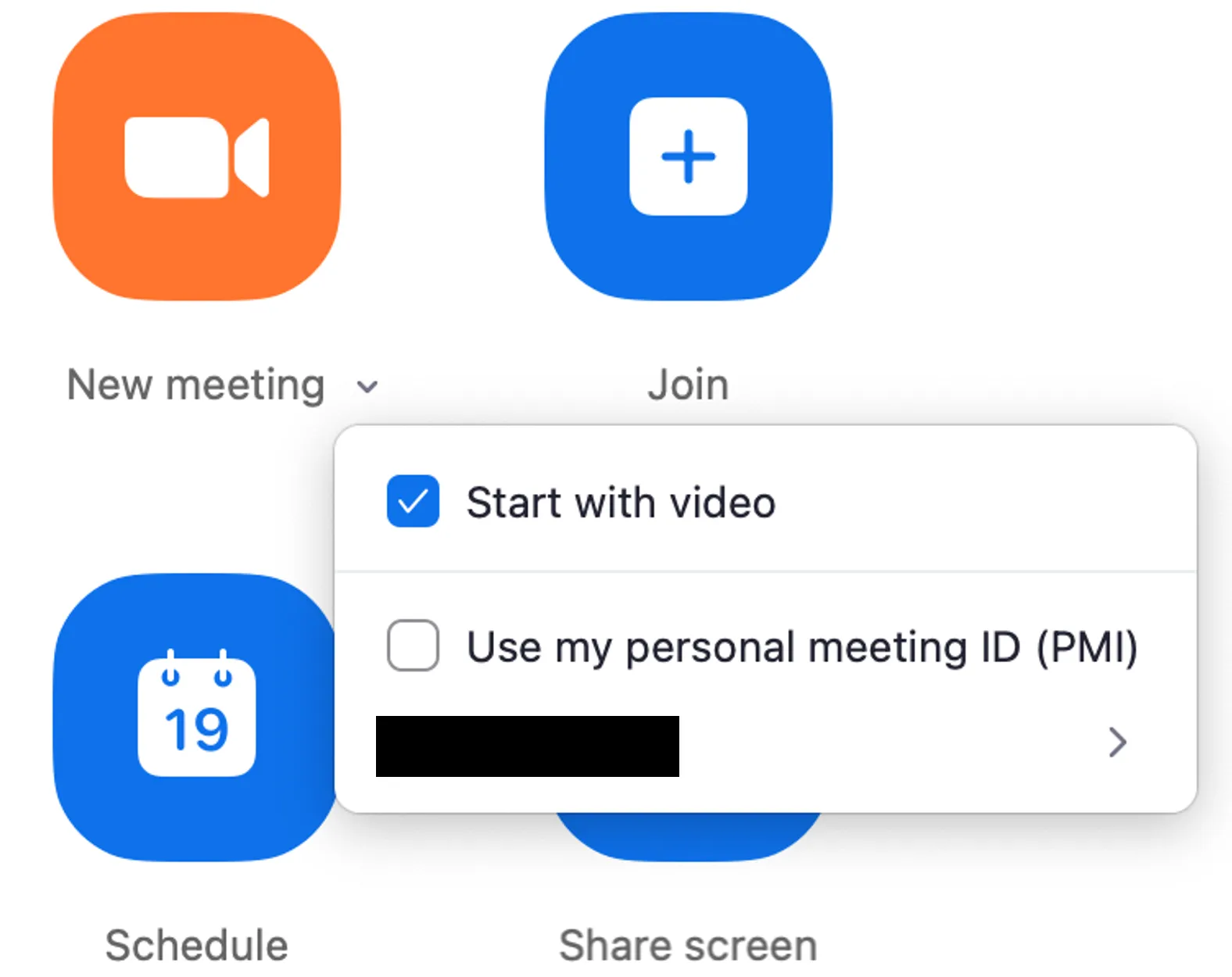 - Press “New Meeting”. There are two types of meeting IDs used in this case: a random meeting ID (11 digits) and the “Personal Meeting ID” (10 digits). By default, a random meeting ID is newly generated each time and becomes invalid immediately after the meeting. On the other hand, if you want to use your personal meeting ID, please press the ”∨” next to “New Meeting” and check “Use my personal meeting ID”.