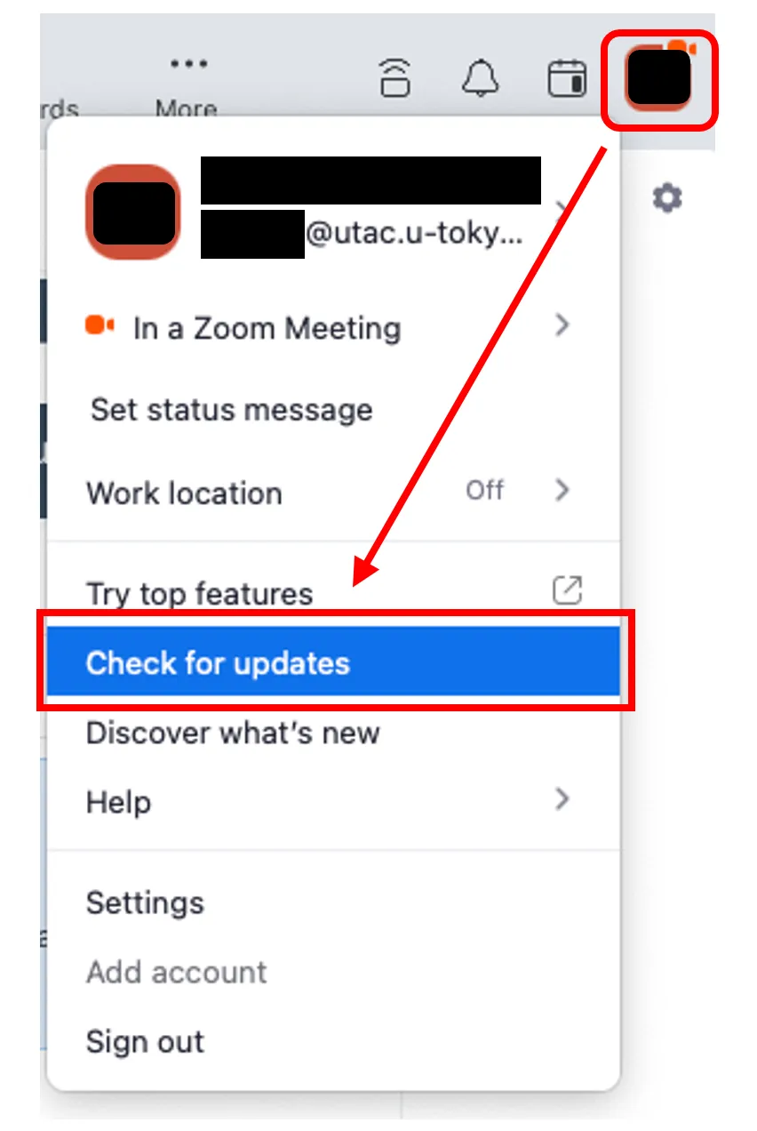 The Zoom app is regularly updated with new versions, where new feature functions are added or bugs are fixed. In addition, Zoom applications older than a particular version sometimes become unavailable. To make your Zoom app safer and more comfortable to use, please update it regularly.