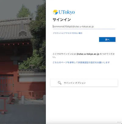 • 入力欄にUTokyo Account(数字10桁の共通ID + @utac.u-tokyo.ac.jp)を入力し,「次へ」を押してください.