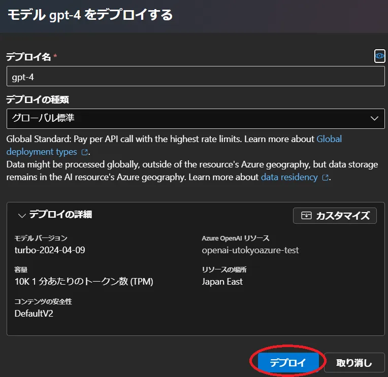 一例として GPT4 モデルのデプロイ手順を進めます.
