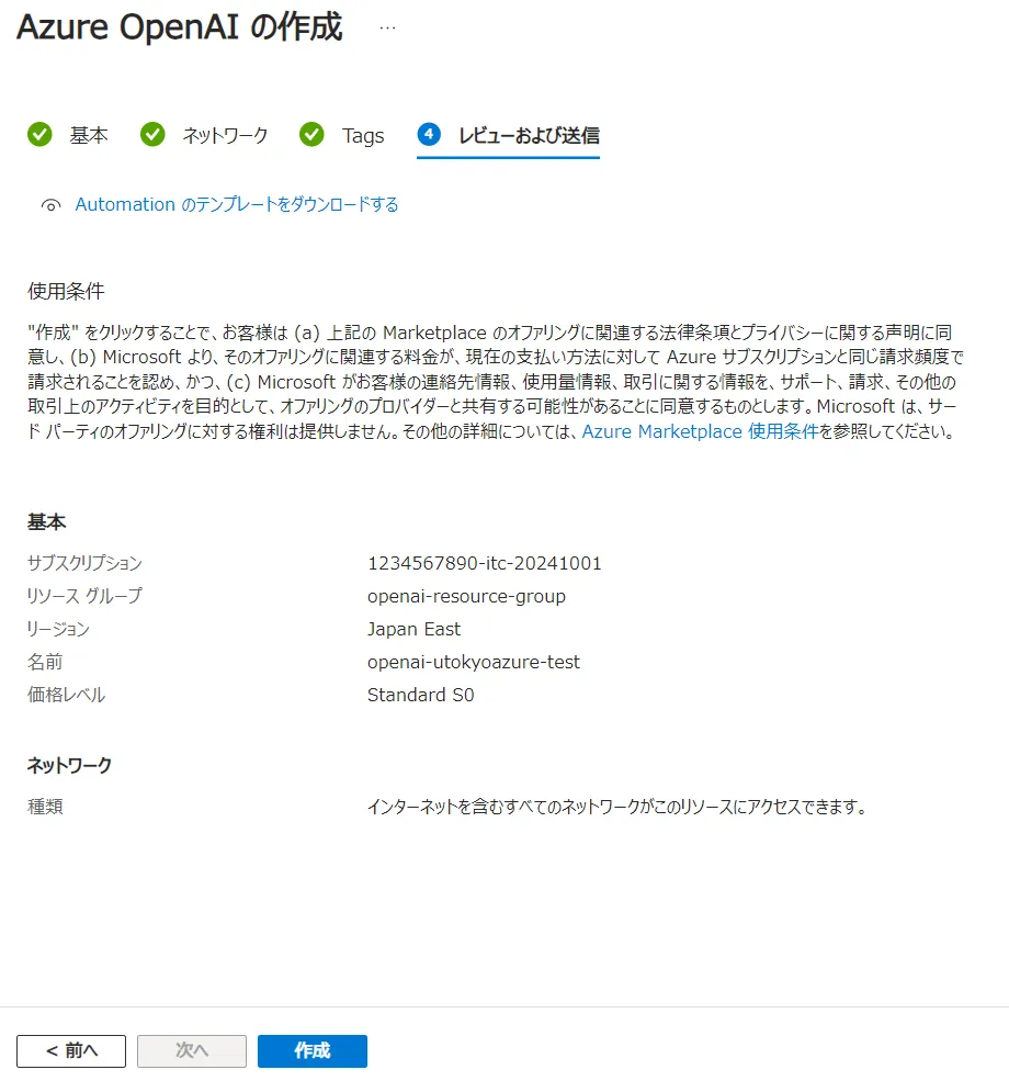 • 名前:リソースの Azure ポータルでの名称を設定します.ここではopenai-utokyoazure-testとしています.