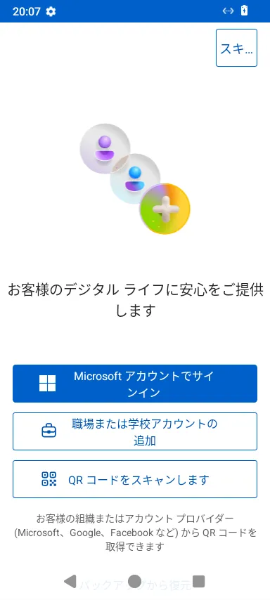- 画像1枚目または2枚目のように,「QRコードをスキャンします」という項目または右下のQRコードボタンが表示されている場合は,それを押してください.そうではなく画像3枚目のような画面が表示されている場合は,画面右上の「+」を押してから,「職場または学校アカウント」「QRコードをスキャン」の順に選択してください.いずれの場合もカメラの利用を許可するか尋ねられることがありますが,その際は許可してください.