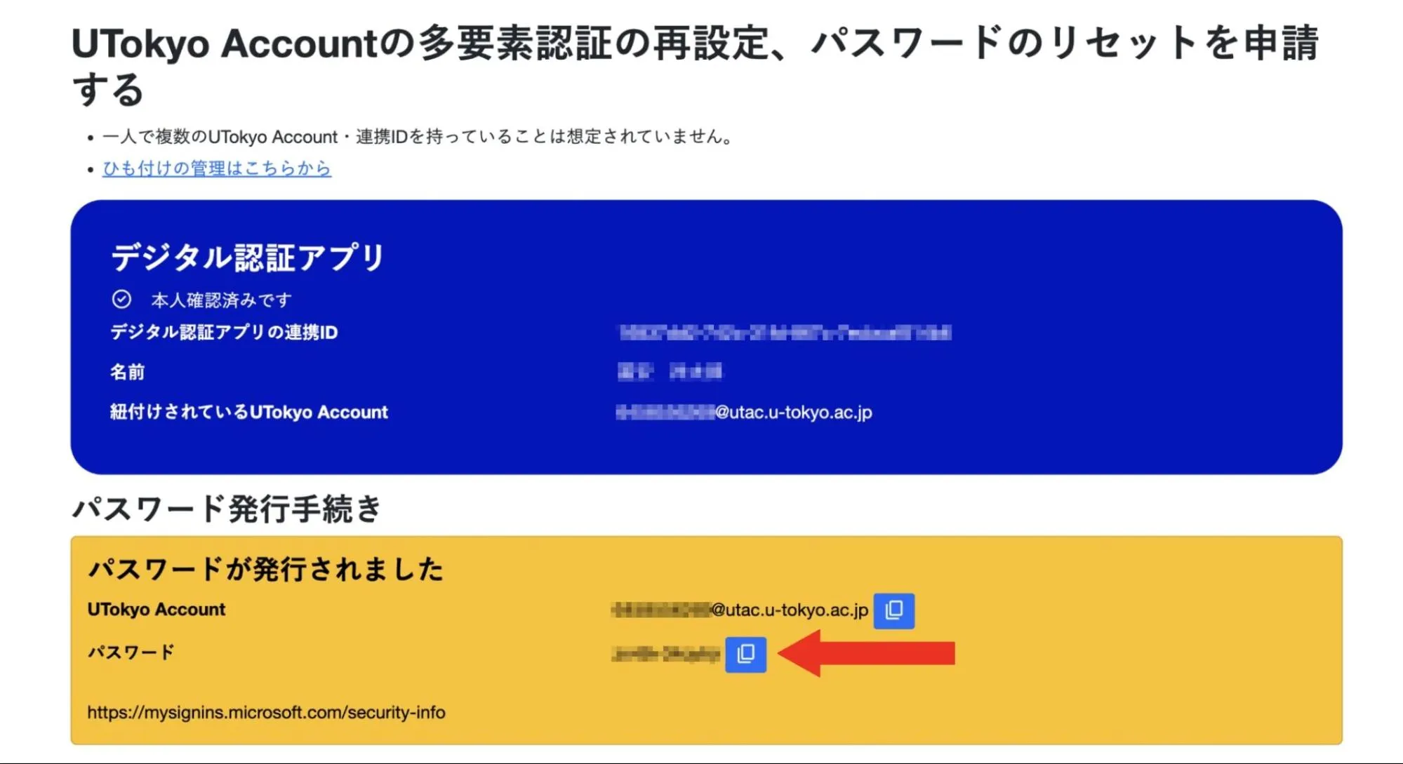 3. 「UTokyo Accountの多要素認証の再設定、パスワードのリセットを申請する」を押してください.