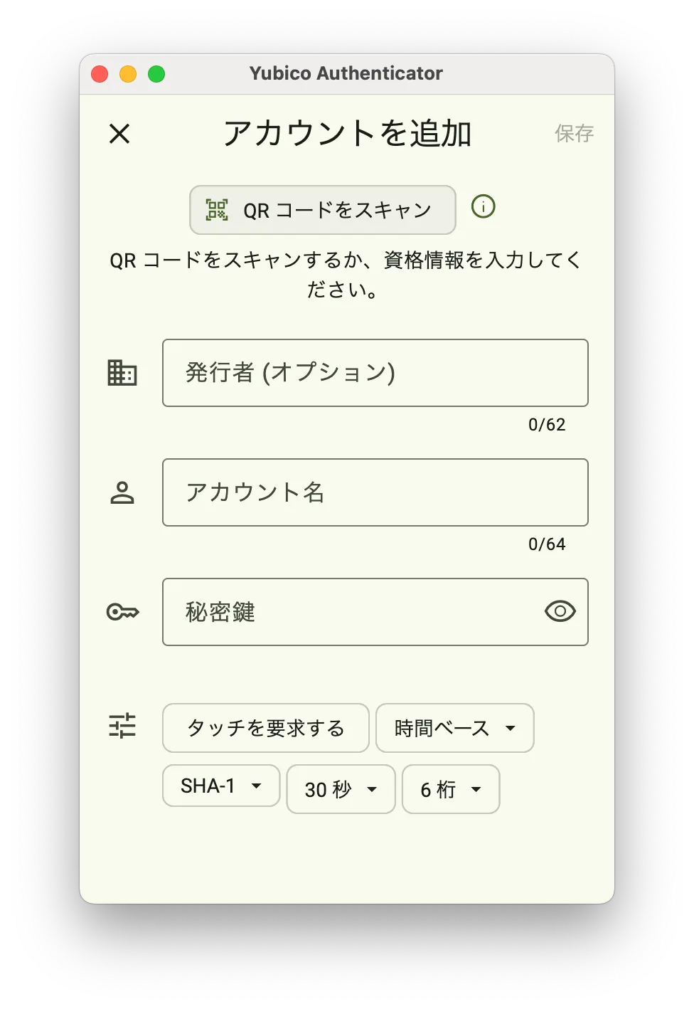 Yubico Authenticatorアプリへのアカウントの追加