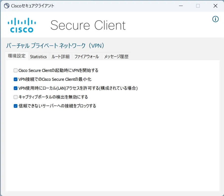 UTokyo VPN接続時は,そのままだとコンピュータの繋がっているローカルネットワークへの通信もVPNを経由します.VPNに接続したままローカルネットワークに設置されたプリンタ等を利用したい場合は,Secure Clientのウィンドウの左下,歯車のボタンをクリックしてください.すると下記のようなウィンドウが出てきます.このウィンドウ(Windowsの場合はウィンドウの「環境設定」タブ)から,「VPN使用時にローカル(LAN)アクセスを許可する(構成されている場合)」にチェックをつけてください.