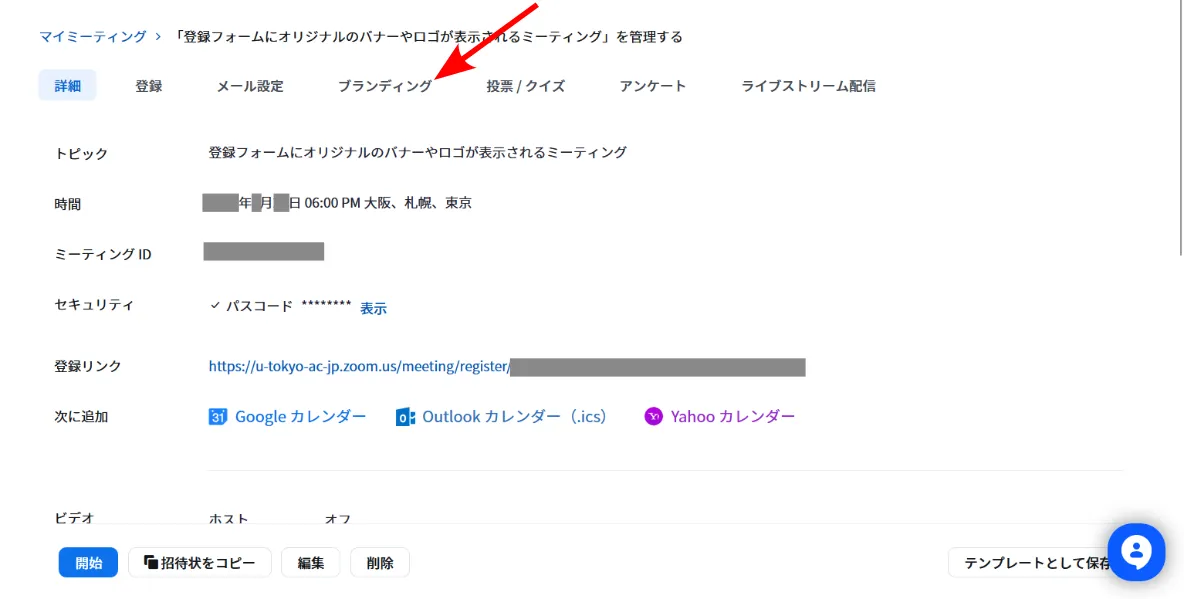 - ミーティングの情報が表示されます.上の方に「登録」「メール設定」等のタブが並んでいます.「ブランディング」タブを選択してください.