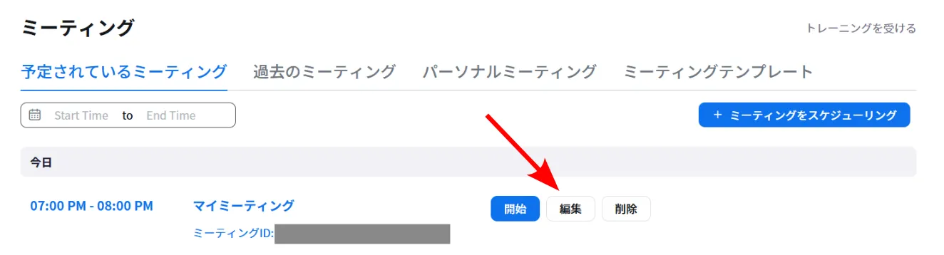 - 参加者の登録機能を有効にしたいミーティングにマウスを重ねると,右側に「編集」ボタンが表示されます.このボタンを押してください.