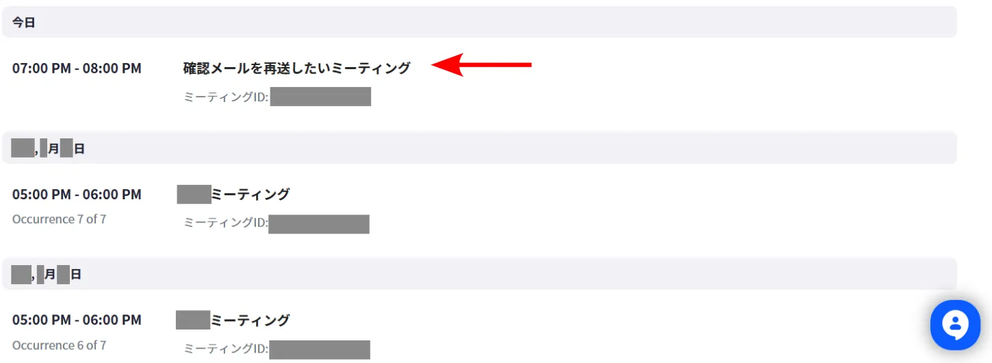 - 自分のスケジュールしたミーティングが,リストとして表示されます.確認メールを再送したい登録済み参加希望者が登録したミーティングの名前を押してください.