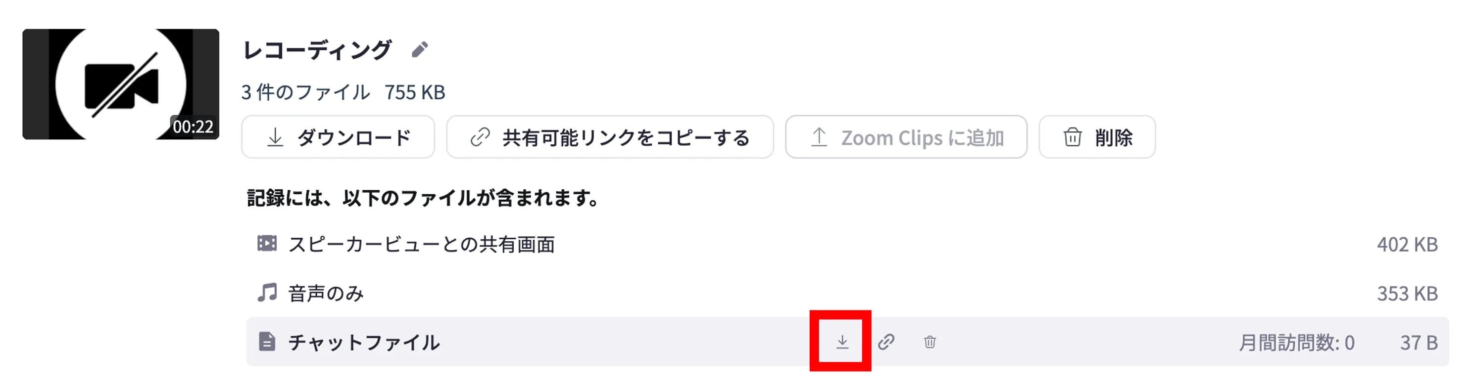 - 「クラウドレコーディング」の画面を開き,該当のレコーディングを選択し,「チャットファイル」をダウンロードしてください.
